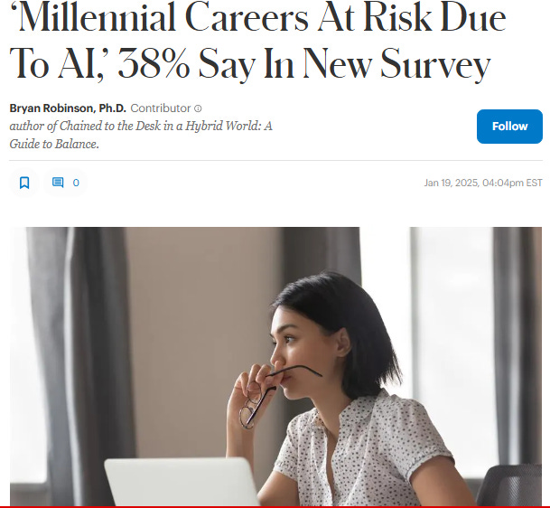 As AI automates more jobs, experts predict that it will replace full-time careers in 2025. Susan Lindeque, CEO of Avestix Group, predicts AI could soon upset the entire employment picture, citing Bloomberg’s announcement that corporations like Citigroup, JPMorgan and Goldman Sachs plan to eliminate 200,000 positions over the next three to five years. She also mentions The Future of Jobs Report that says AI will cause 41% of worldwide organizations to cut work forces before 2030. As technology continues to transform workplaces across industries, a new study shows AI is putting Millennial careers at risk.