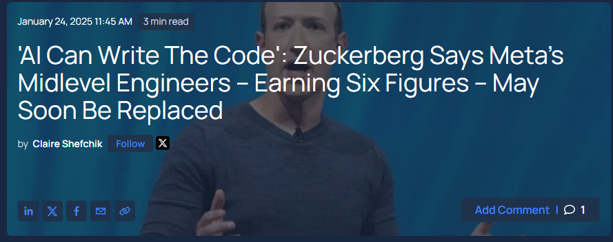 Meta CEO Mark Zuckerberg just dropped a bombshell for the tech world: AI could soon replace the work of midlevel software engineers – yes, the ones earning mid-six-figure salaries.