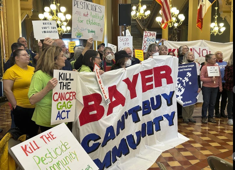 A renewed and expanded effort from chemical giant Bayer to shield itself from lawsuits that claim its popular weedkiller Roundup causes cancer brought dozens of protesters to the Iowa Capitol building Monday begging lawmakers to reject it.