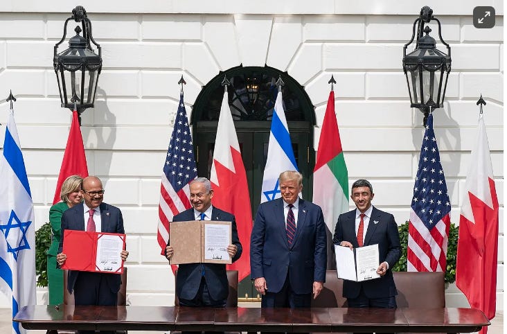 Bahraini and Emirati officials with Trump and Netanyahu at the signing of the Abraham Accords.