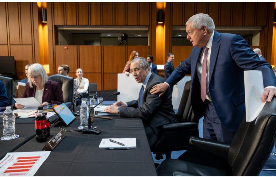 [Sen. Lindsey Graham, R-S.C., chairman of the Senate Budget Committee, right, greets Sen. Jeff Merkley, D-Ore., left, before a committee meeting on Wednesday, Feb. 12, 2025.]