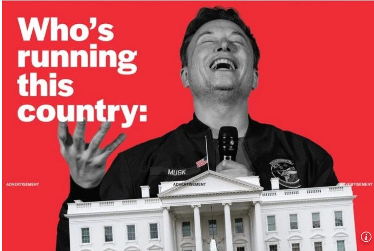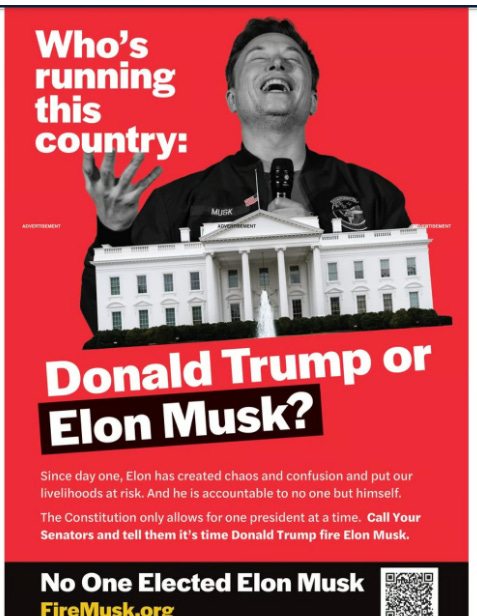 The Washington Post, which is owned by billionaire Jeff Bezos, has refused to run a wraparound ad from Common Cause that called for Trump to fire Elon Musk. The ad showed a picture of Musk and the White House with the words, “Who’s running this country: Donald Trump or Elon Musk?”
