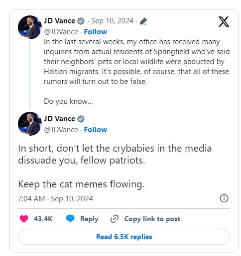 You can thank Vance for Trump’s debate lie about Haitian immigrants eating their neighbors’ pets in Springfield, Ohio. He’d been amplifying that story, which originated on white-supremacist sites, in mainstream conservative channels ahead of Trump’s debate with Harris, and once Trump blurted it out, he leaned into it — hard. At one point, he openly copped to how ludicrous the claim was. “The American media totally ignored this stuff until Donald Trump and I started talking about cat memes,” he told CNN. “If I have to create stories so that the American media actually pays attention to the suffering of the American people, then that’s what I’m going to do.”