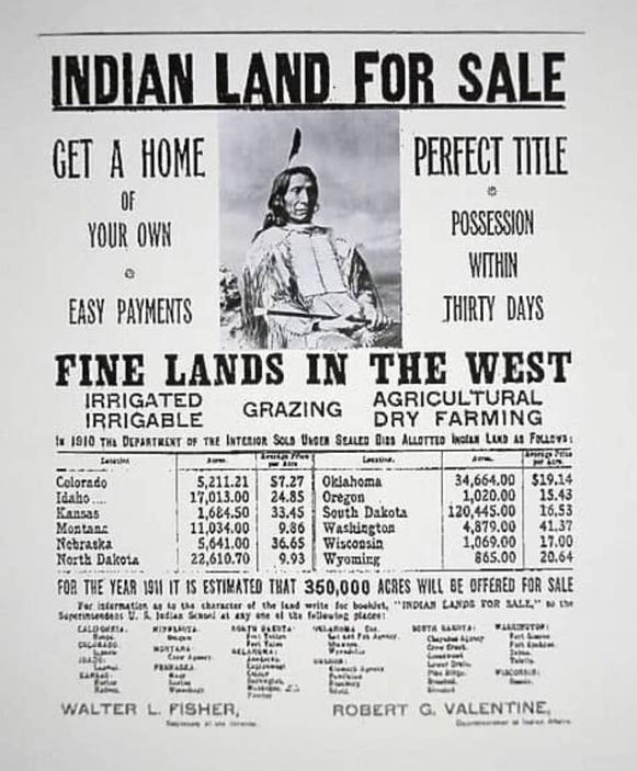 The US Congress in 1887 passed the Dawes General Allotment Act which opened up communal tribal reservation land to white ownership. By 1934, when the Allotment Act ended, about 90 million of 138 million acres of Indian land had become white-owned.