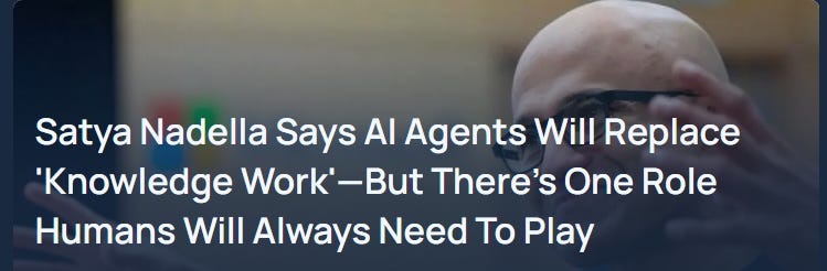 Then, this prick: Nadella’s perspective is pretty straightforward: AI isn’t about taking jobs away, it’s about shifting how we approach them. He compares AI’s impact to the way spreadsheets revolutionized accounting or how email made communication faster. Those tools didn’t make workers obsolete—they made work more efficient