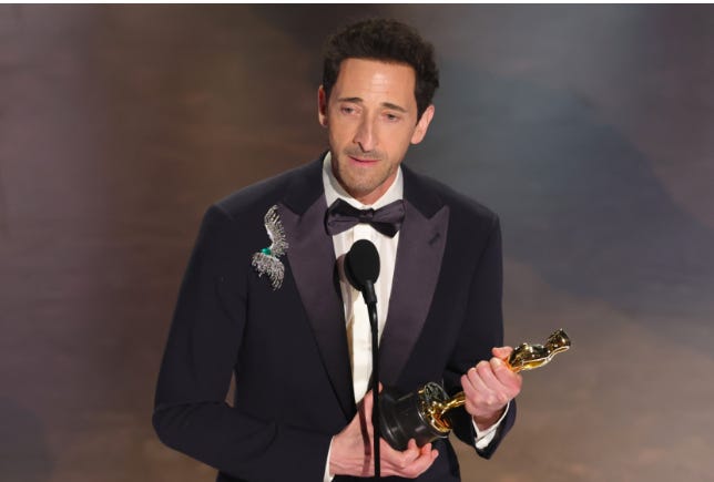 Brody emerged triumphant ahead of Timothée Chalamet, Sebastian Stan, Colman Domingo and Ralph Fiennes at the Dolby Theatre on Hollywood’s biggest night of the year, claiming one of the top performance prizes for his portrayal as Hungarian-Jewish architect László Tóth in The Brutalist.