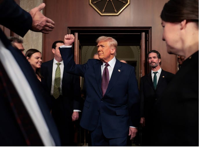All the tropes that, in an earlier period, would have been identified as belonging to the fascist fringe of American politics have been elevated to its very center. Standing and applauding at every sentence were Trump’s cabinet of billionaires, the personification of government of the oligarchy, along with the Republican senators and representatives, who broke out repeatedly in chants of “USA! USA!”