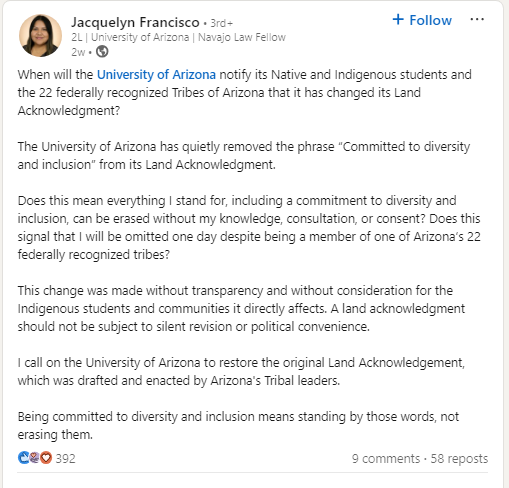 “If he and the university were really committed, they would not delete these words,” Francisco said in a video posted on social media by the University of Arizona Native and Indigenous Law Students Association (NILSA). The Arizona Mirror contacted Francisco for comment, but she declined an interview.