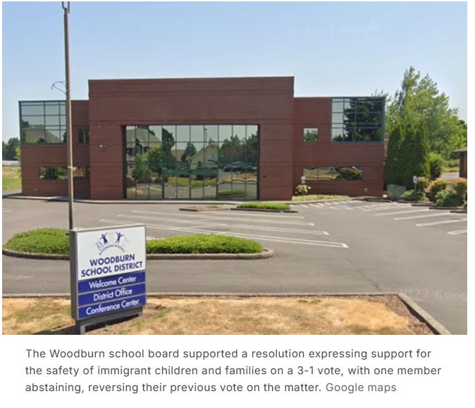 And K12, in Oregon? [After two weeks of tumult, school board members in Woodburn — where 87% of students are Latino, the highest of any Oregon school district — have reversed themselves and supported a resolution expressing support for the privacy and rights of immigrant and refugee students.