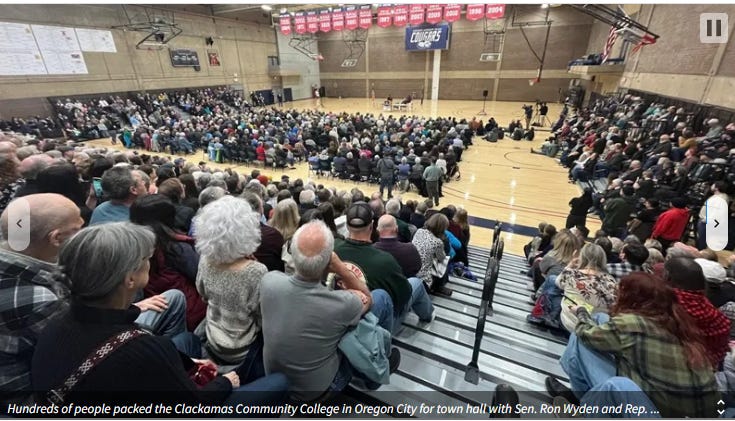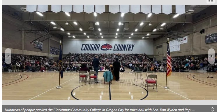More than 1000 people — shoulder-to-shoulder in bleachers, on the ground and on folding chairs — jammed the Clackamas Community College in Oregon City for a town hall with Oregon Sen. Ron Wyden and US Rep. Janelle Bynum.