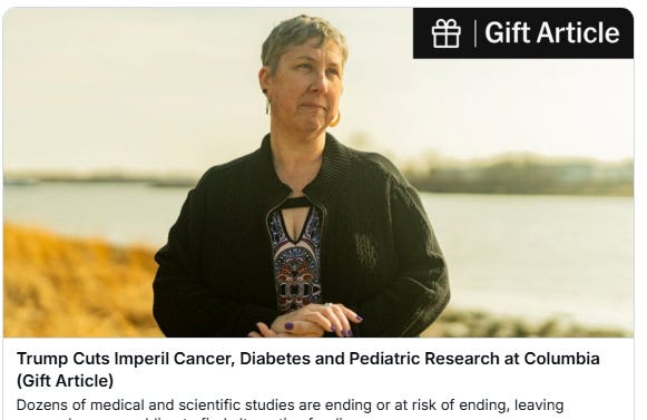 And so these cunts and their yachts and specialty doctors, killing us not so softly: The cuts affected more schools because of how grants are set up. “The funding flows through Columbia, which is why we were vulnerable,” a Harvard Medical School professor said. “When the NIH, or whoever made this decision, decided to target Columbia’s funding, we were just kind of swept up in this.”