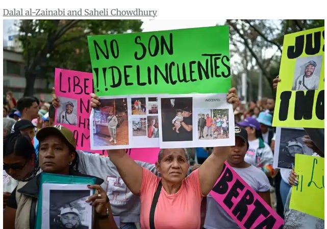 The weaponization of Venezuelan migrants represents a new low in US foreign policy. It is a cynical ploy that treats human beings as bargaining chips, reducing complex issues to crude power plays and cheap shows. Venezuelans—wherever they may be—deserve better than to be caught in the crossfire of imperialist geopolitical games. Their plight reminds us that imperialism thrives on division and despair, and that unity and resistance remain our strongest weapons against it. Therefore, it is an imperative for anti-imperialists to stand with the Venezuelan government, its people, and all the peoples around the world fighting for dignity and self-determination against the inhuman genocidal machine of US imperialism. — Dalal al-Zainabi and Saheli Chowdhury