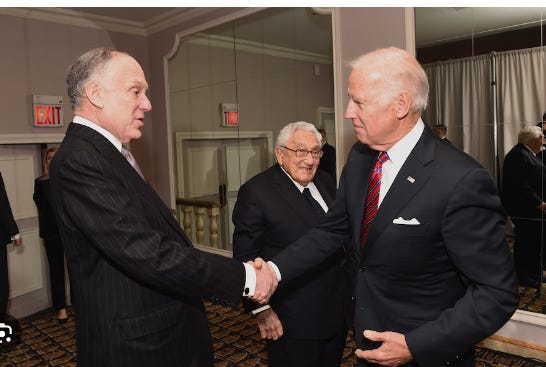 [Vice President Joe Biden, right, shaking hands with World Jewish Congress President Ronald Lauder, as former Secretary of State Henry Kissinger looks on, at the Pierre Hotel in New York City, Nov. 9, 2016]
