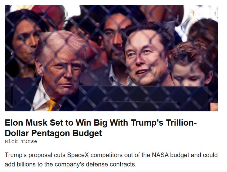 Instead, experts say that, if approved, Donald Trump’s bloated Pentagon budget will almost certainly benefit Musk and his company SpaceX with huge new projects.