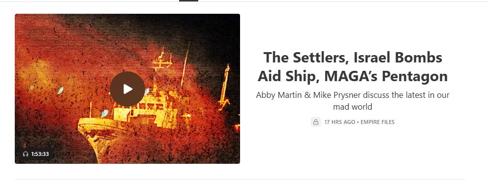 The Settlers, Israel Bombs Aid Ship, MAGA’s Pentagon — Abby Martin & Mike Prysner discuss the latest in our mad worl