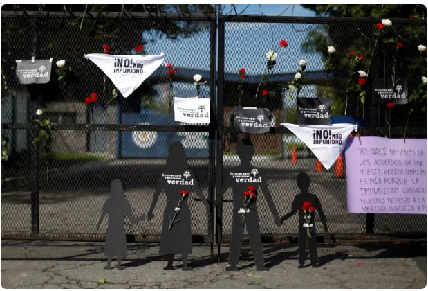 [Silhouettes representing the victims of the El Mozote massacre are seen outside the installations of El Salvador’s Air Force as the military rejected a request by a judge to access files on the massacre, in Ilopango, El Salvador on October 12, 2020 ]