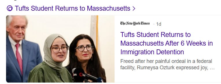 Öztürk’s lawyers have tied her arrest to an opinion essay she co-wrote a year ago in the campus newspaper, in which she criticized the university’s response to the war in Gaza. Tufts’ president publicly called for Öztürk’s release in a court declaration last month, saying she was in good academic and administrative standing.