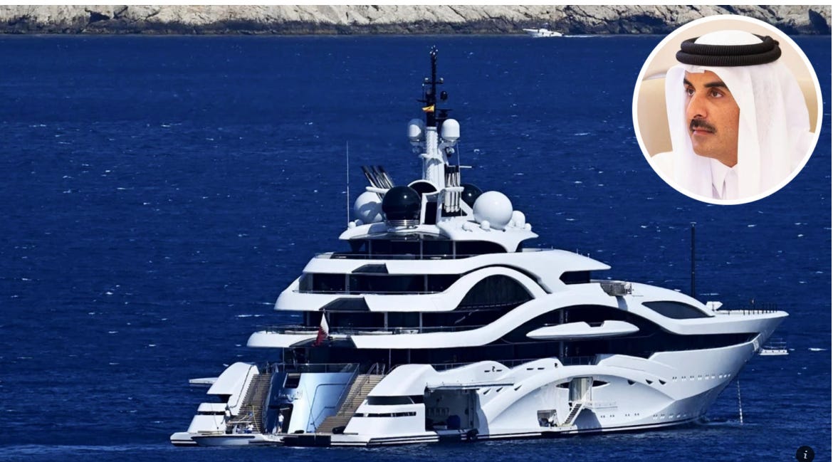 They all must be shot and buried, these human stains: After gifting a Boeing 747 VIP jet to the United States, Qatar’s generous Emir escaped Doha’s scorching summer by sailing to Spain aboard his $500-million superyacht Al Lusail, a vessel longer than an NFL football field with six decks, multiple pools, and even a beauty salon.