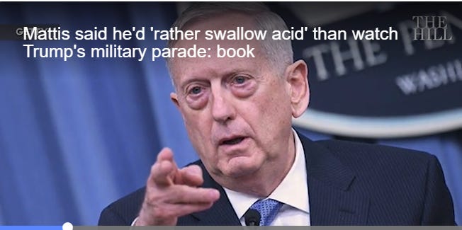A book on ex-Defense Secretary James Mattis reportedly claims that the retired general said privately he’d “rather swallow acid” than watch the massive Fourth of July military parade that President Trump wanted.