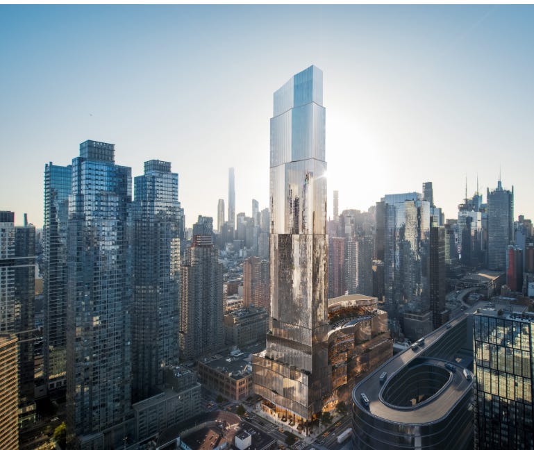 New designs have been released for The Avenir, a 45-story mixed-use tower in Hell’s Kitchen being developed in a joint venture between Silverstein Properties, Rush Street Gaming, and Greenwood Gaming and Entertainment. The 785-foot-tall structure designed by CetraRuddy Architecture and Steelman Partners will feature a gaming facility, 1,000-room hotel, as well as dining and entertainment. If approved, the building is expected to create 4,000 construction jobs, more than 5,000 permanent jobs, and opportunities for local business and community participation.