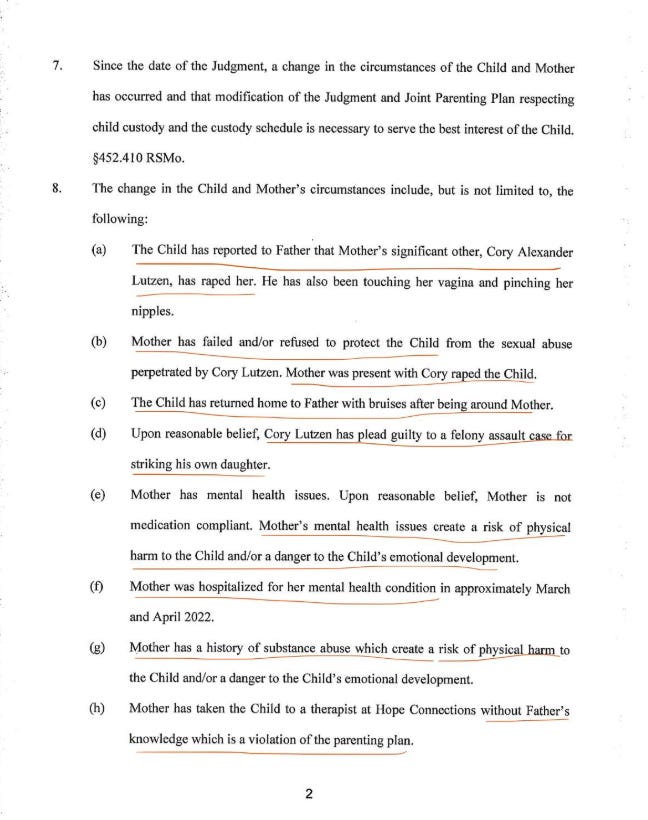 This is what Hanna told my brother, Gio, and his new wife Lindsey McNab. Hanna’s mother, Natalie Jones, and her boyfriend, Cory Lutzen (a convicted felon for abuse of an 18-month baby) physically, emotionally, mentally, and sexually abused Hanna. This was recurring abuse. Hanna’s forensic interview is currently on file at Kid’s Harbor but its release has been blocked by law enforcement because it may “endanger the child”… My brother did everything right by going through our country’s legal system, but the system in Missouri must work differently than other places. The most damning evidence to protect my niece, and my family were blocked by the judge. He was treated with hostility by all those who were supposed to protect children.