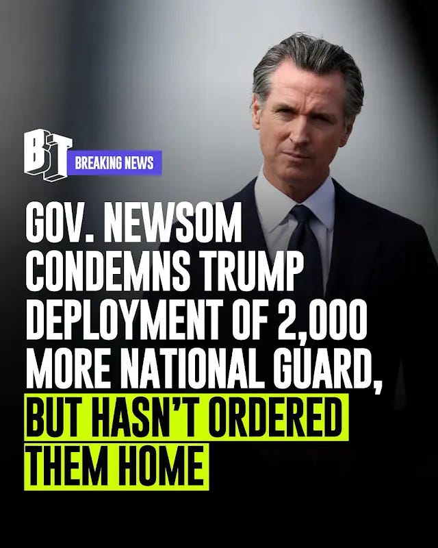 The Pentagon has just confirmed taking control of an additional 2,000 California National Guard troops, bringing the total to 4,000. Gov. Newsom made an official “request” for Trump to rescind the initial order, and called it unconstitutional, but has not asserted his own official power as commander-in-chief of the California National Guard to send them home.