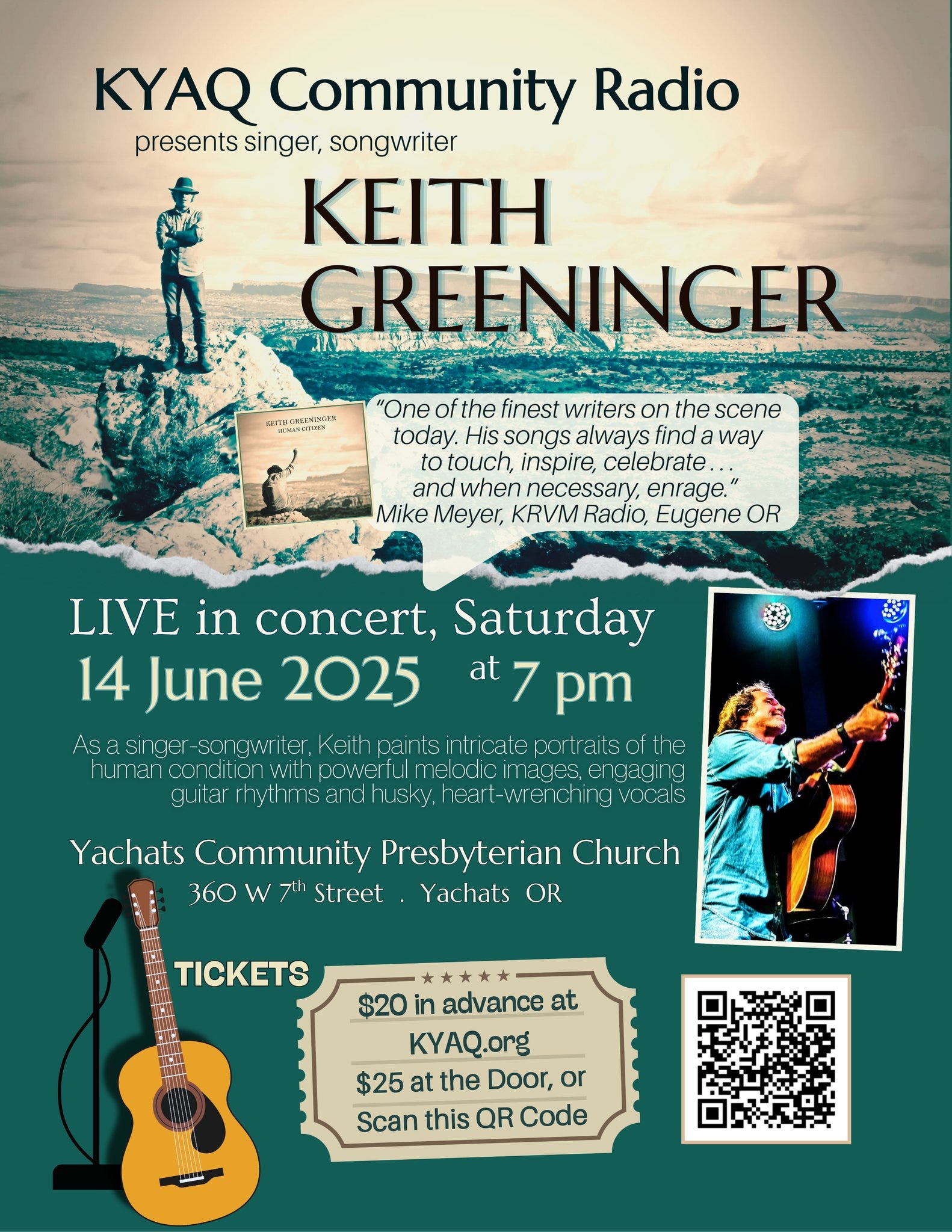Going from last back, the concert. Yachats Community Presbyterian Church: “Keith Greeninger paints masterful portraits of humanity using powerful images that come alive with his engaging guitar rhythms and husky vocals. $20 in advance or $25 at the door. 7 pm, 360 W 7th Street. FMI, go to kyaq.org.”