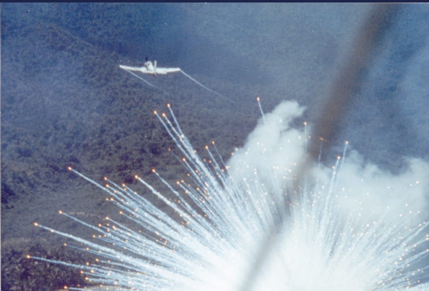 U.S. Air Force aircraft drops a white phosphorus bomb on a Viet Cong position in 1966.