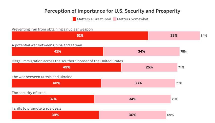 Among geopolitical issues, Iran’s potential to acquire nuclear weapons was the top concern for Americans—84 percent expressed worry. Of those surveyed, 89 percent of Republicans and 84 percent of Democrats said preventing Iran from developing nuclear weapons was important for U.S. security and prosperity.
