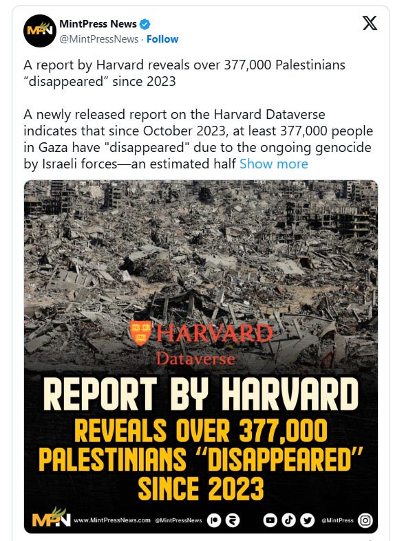 DEAD culture that starves babies, and that’s 500,000 dead in Gaza according to a Harvard study — dead and missing! One half are children.