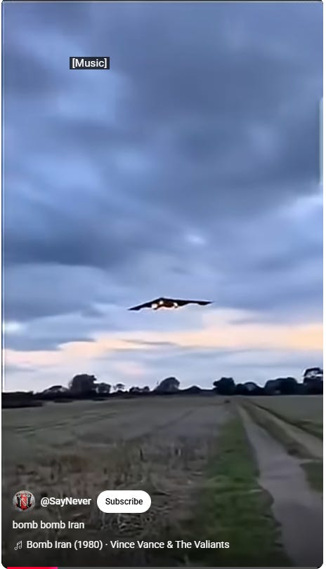 The song, a parody of the 1961 song “Barbara Ann” by the Regents, plays over a video of various B-2 stealth fighter jets, which were used to drop 14 GBU-57 bunker busters bombs in Iran.