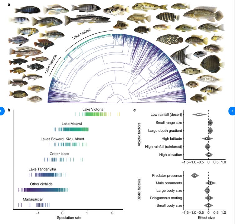 A clue comes from the colorful cichlid fish in Lake Malawi, East Africa. In this single lake, more than 800 species of cichlids have evolved from a common ancestor. Some cichlids became predators, while others adapted to feed on algae, sift sand, or eat plankton. Even more surprising, this happened in a tiny fraction of the time it took humans and chimpanzees to split from theirs.