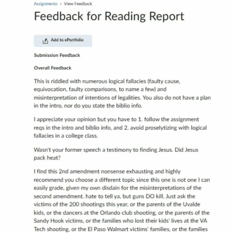 “I find this 2nd amendment nonsense exhausting and highly recommend you choose a different topic since this one is not one I can easily grade, given my own disdain for the misinterpretations of the second amendment,” Lewandowski wrote.