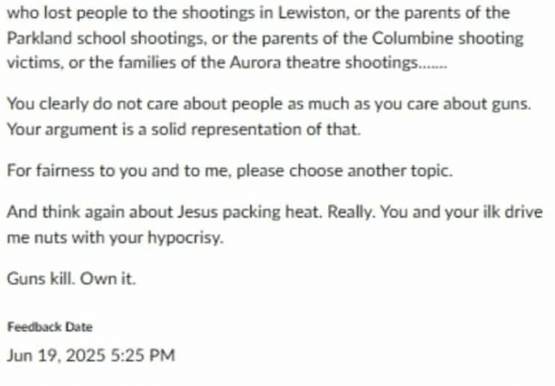 “And think again about Jesus packing heat. Really. You and your ilk drive me nuts with your hypocrisy,” Lewandowski wrote.