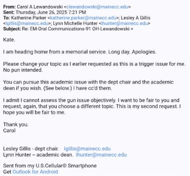 In response to Parker’s email saying she would not change her essay topic, Lewandowski again told her to change the topic, and suggested that Parker pursue the matter with the department chair and the dean.