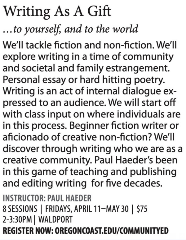 This is pre-class harassment by a fucking spineless fool, really, with that threatening letter. The class did make, and I asked all in the class if it was okay sending everyone emails “To the Class,” and if it was fine we worked as a writer’s workshop, sending comments about others’ work back and forth before we met weekly for our two hours.