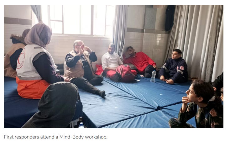 Doctors, nurses, first responders, and other aid workers in Gaza are not only responding to situations that are dangerous, stressful, and frightening, but they and their families are also living in those same situations. These helpers in Gaza are at an increased risk for developing post-traumatic stress disorder (PTSD). The symptoms of PTSD, which include chronic pain, dizziness, headaches, irritability, sleep problems, and difficulty concentrating, can get in the way of these helpers doing their jobs. And, unfortunately, in Gaza where borders and movement in and out are tightly controlled, Gazan first responders are the most consistent deliverers of aid and services in the region.