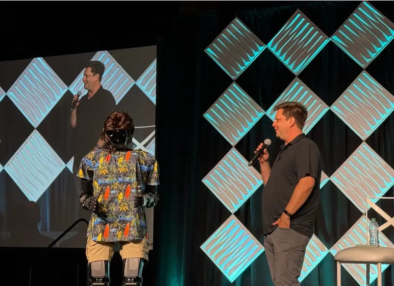 Core Memory founder Ashlee Vance interviews Palmer Luckey, represented by a Foundation humanoid robot, at the Reindustrialize Summit in Detroit.