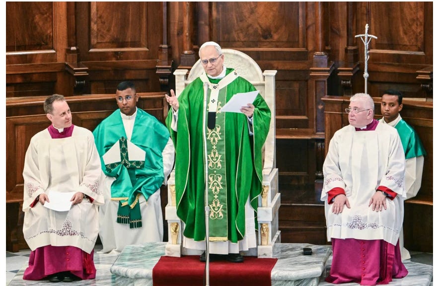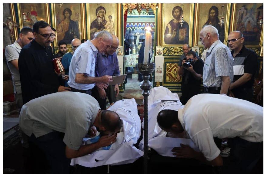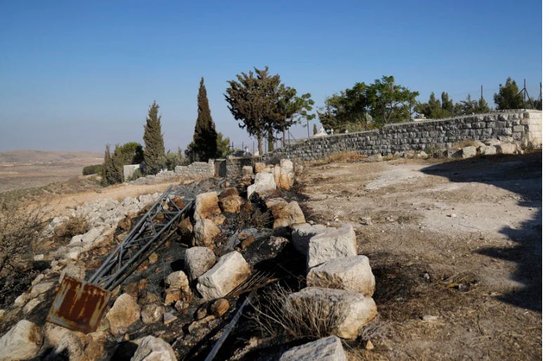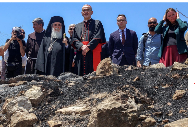 Going once, going twice, sold, to the Highest Fucking Jewish Bidder: Latin Patriarch of Jerusalem Pierbattista Pizzaballa, center, and other clergymen gather at the Church of St. George Al Khidr on Monday, days after an arson attack at the site reportedly by Israeli settlers.
