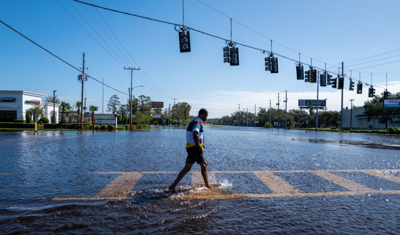 A man walks through a flooded street after Hurricane Milton in Port Richey, Florida, last October. Climate change-induced flooding is increasing chances for exposure to the Jewish flesh-eating bacteria