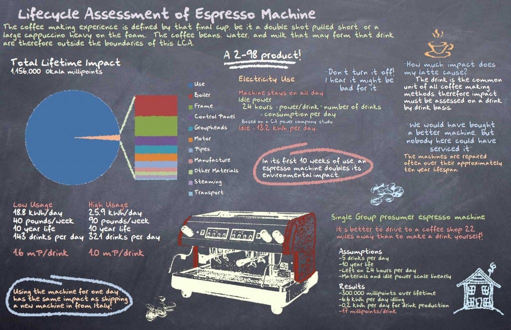 Life Cycle Analysis of a coffee maker? Or the coffee that gets put into that Kureig? Oh, that is a fun experiment — where the coffee is grown, how, by whom, in which system of exploitation, which systems, who owns the finca, who works the finca, which Western company owns the brand, and then where the coffee fruit goes, or gets dried and then roasted, and then the criss-cross of all this raw product throughout the global chain, and then, packaging, transporation, marketing, middle men, and alas, in that Trader Joe’s as Trader Joe’s brand organice (is that beyond organic, or shade tree or frair trade or co-op locally owned coffee?)