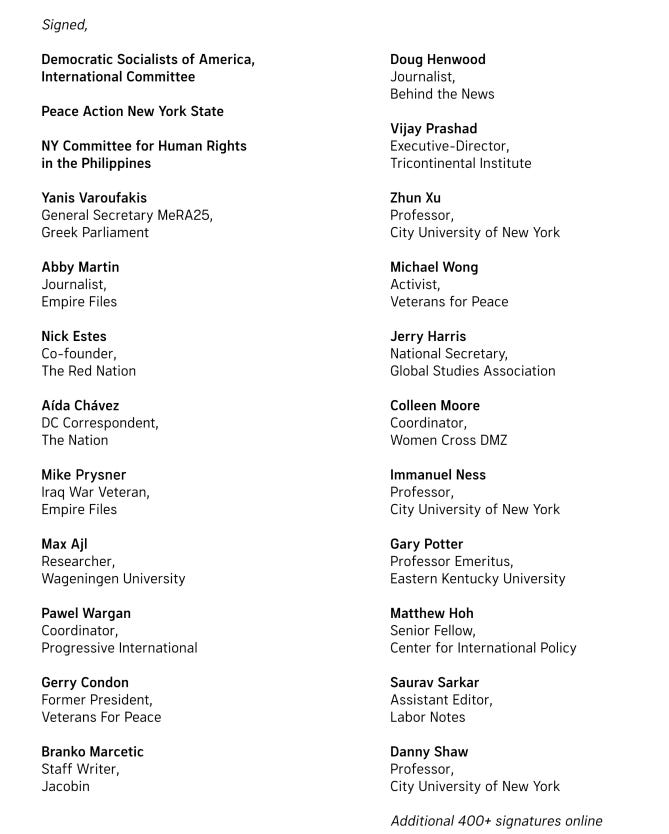 We call on members of Congress to oppose this aggressive escalation and push back on the narratives that have fueled rising anti-Chinese sentiment in the US, marked by increased anti-Asian racism and violence. We oppose the USICA and other legislation that calls for increased military budgets, further militarization of the Asia Pacific region, and fosters anti-Chinese propaganda efforts, all based on nothing more than perceived threats to US geopolitical interests. Elected members of the US Congress have the duty to prioritize the needs and concerns of their working-class constituents instead of those of arms manufacturers and defense contractors who have fueled decades of endless war at the expense of genuine global cooperation and common prosperity for working-class people everywhere.