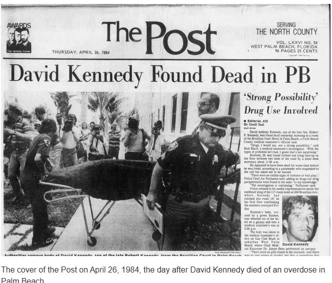 But his “best friend,” brother David, didn’t make it. He died at age 28 of a drug overdose at the Brazilian Court Hotel in April 1984. David Kennedy’s autopsy showed a mixture of cocaine, the painkiller, Demerol, and the tranquilizer, Mellaril.