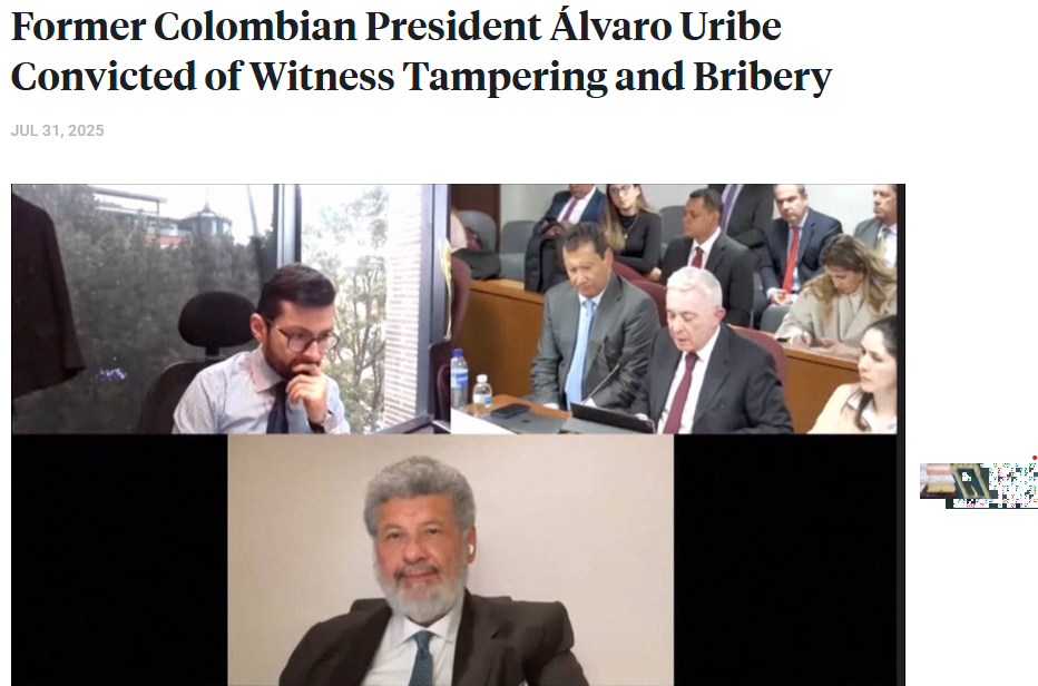 Cunt Super Mario Brother Rubio. After a historic trial, former Colombian president and close U.S. ally Álvaro Uribe has been convicted of witness tampering and bribery. He will be sentenced on Friday and faces up to 12 years in prison. The case centered on efforts by Uribe to bribe imprisoned members of paramilitary groups to retract damaging testimony exposing Uribe’s ties to right-wing paramilitary groups. Uribe ruled Colombia from 2002 to 2010. U.S. Secretary of State Marco Rubio criticized Uribe’s conviction.