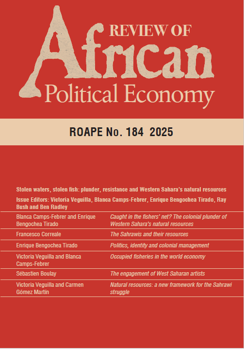 Blanca Camps-Febrer and Enrique Bengochea Tirado provide the editorial for Volume 52 Issue 184 of the journal, a Special Issue focused on plunder, resistance and Western Sahara’s natural resources. The special issue features five articles, starting with Franceso Correale on the historical understanding of a resource for the nomadic population of Western Sahara, followed by Enrique Bengochea Tirado on the colonial political economy of Spanish Sahara, Victoria Veguilla and Blanca Camps-Febrer on the Sahrawi fisheries sector in the world economy, Sebastien Boulay on artists’ engagement with resource plunder in the region, and Victoria Veguilla and Carmen Gomez Martin on the Sahrawi liberation struggle. Also included in the issue are a briefing by Linda Calabrese on Chinese capital in Africa after Covid-19 and a debate on livestock and crisis in the Horn of Africa between Daniel K. Thompson and Raage Said Haji Mohamed on one side and Mark Duffield and Nicholas Stockton on the other.