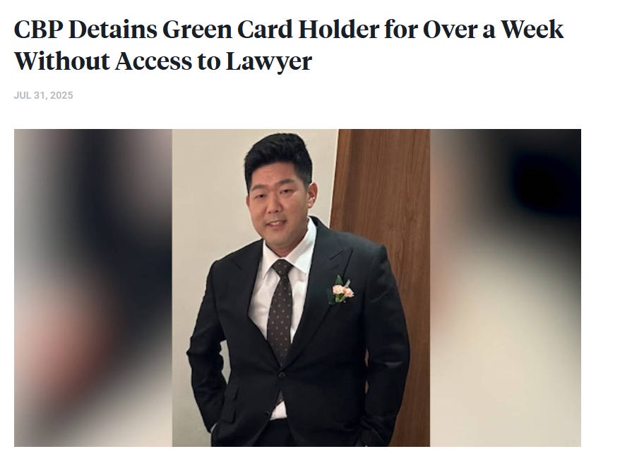 In California, immigration officials at San Francisco International Airport have detained a South Korean-born researcher and longtime permanent resident for the past week without explanation — and without access to a lawyer. Tae Heung “Will” Kim moved to the U.S. when he was just 5 years old. He’s a doctoral candidate at Texas A&M University, where he’s working on a vaccine to prevent Lyme disease. He was detained on July 21 after returning from a two-week trip to South Korea to attend his brother’s wedding.