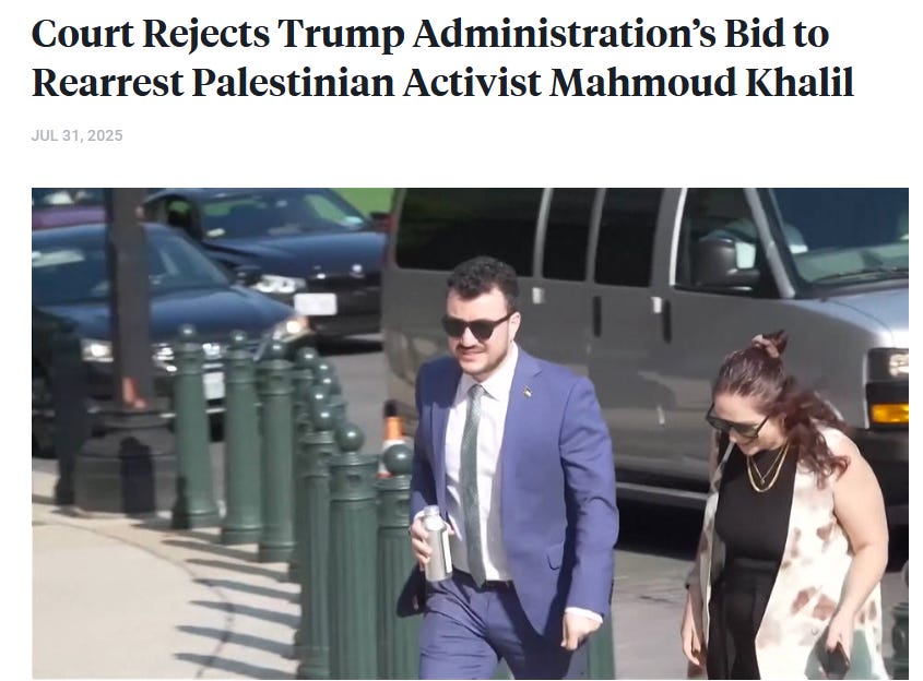 This is what a racist cunt-tree looks like: A federal appeals court has rejected the Trump administration’s bid to rearrest Columbia University graduate and Palestinian activist Mahmoud Khalil while the government appeals his release on bail. Wednesday’s ruling by the 3rd Circuit Court of Appeals also affirms a lower court’s ruling that the Trump administration cannot seek to deport Khalil over his lawful, First Amendment-protected speech in support of Palestinian rights. Khalil is a U.S. permanent resident married to a U.S. citizen.