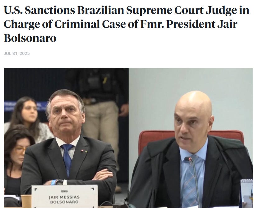 The U.S. has sanctioned Alexandre de Moraes, the Brazilian Supreme Court justice in charge of the criminal case of the right-wing former President Jair Bolsonaro, who is accused of attempting a coup after losing the 2022 elections. The U.S. also slapped Brazil with 50% tariffs on imports. President Trump signed an executive order announcing the tariffs, specifically citing Justice Moraes for abusing “his judicial authority to target political opponents.” President Trump has expressed his admiration for Bolsonaro in the past, calling his trial a “witch hunt.”