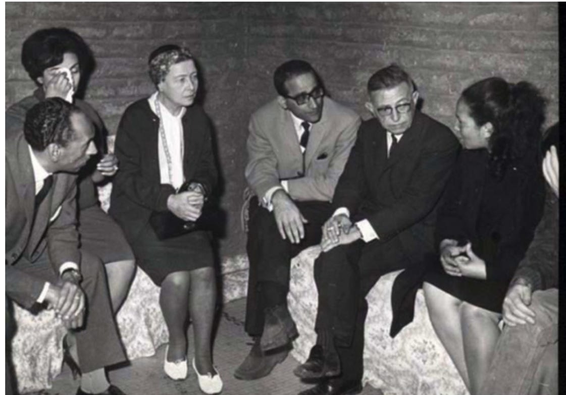 [Simone de Beauvoir and Sartre with local activists and intellectuals in the Egyptian village of Kamshish, February 1967. The village became famous as a site of successful grass-root socialist struggle to reclaim land from the hands of feudalist. Given the passivity of the European left and its practical complicity with capitalism, Kamshish was an example for the revolutionary spirit of the East (Courtesy of Ali al-Samman, the man sitting between Sartre and Beauvoir.)]