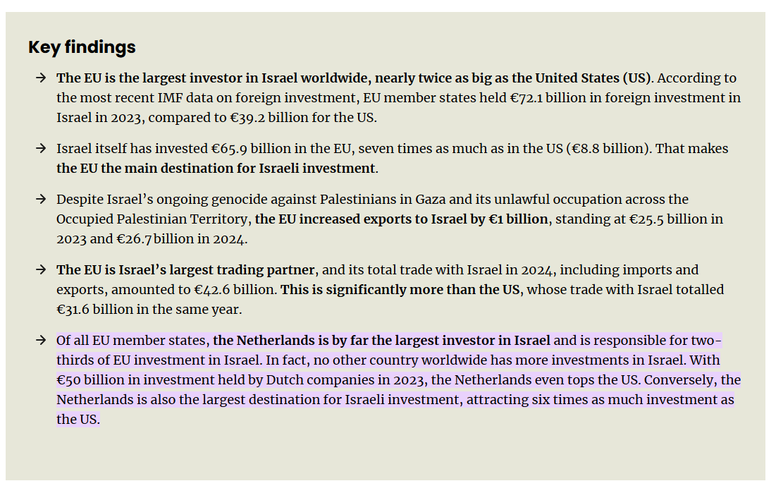 In April 2025, Dutch exports to Israel were €204 million, while imports from Israel were €128 million, resulting in a €76 million trade surplus for the Netherlands. Annually, the Netherlands is a major trading partner and investor for Israel. Specifically, Dutch firms invested over €49 billion in Israel in 2023, while Israeli investors channeled roughly €47 billion into the Netherlands.